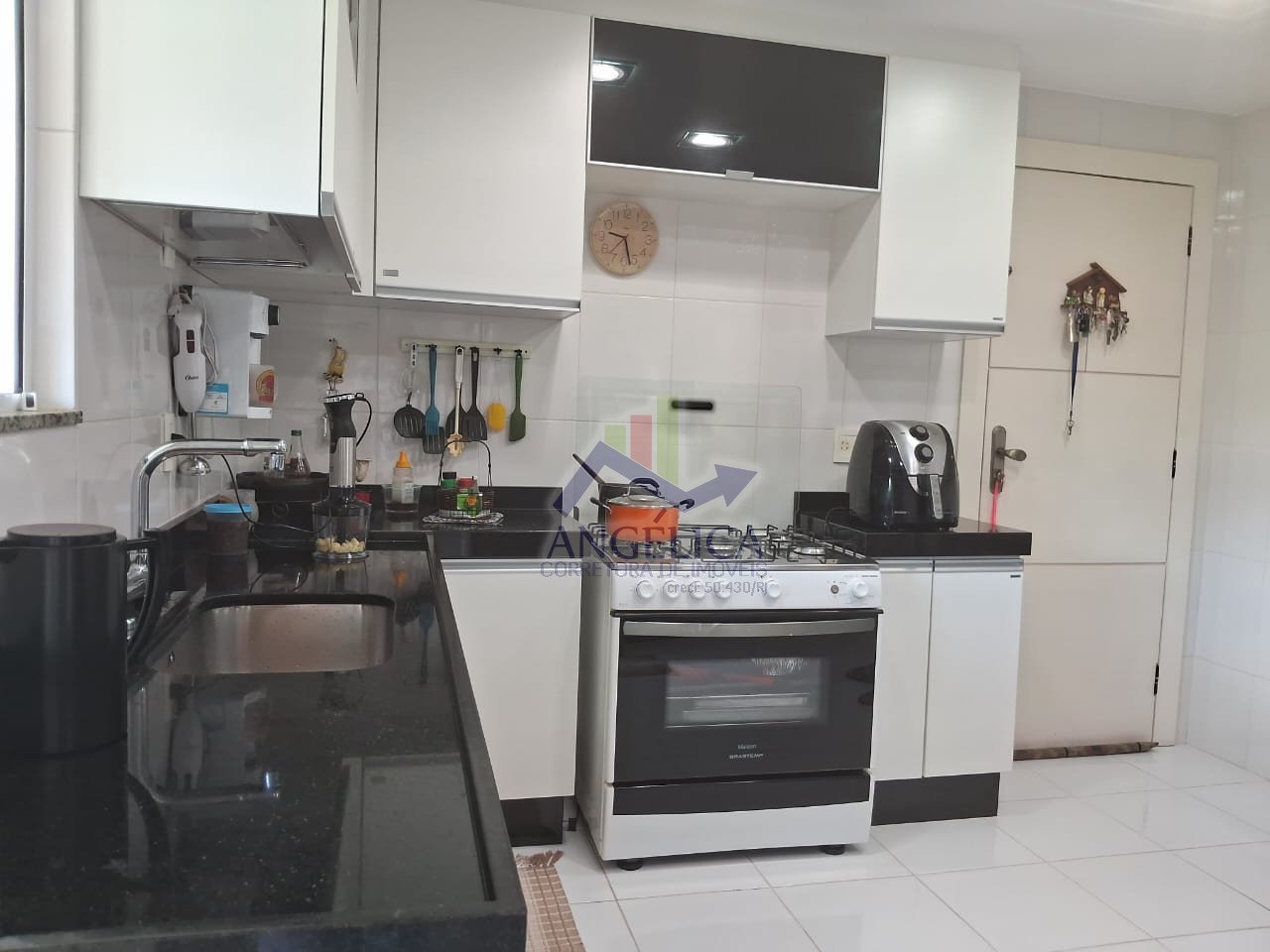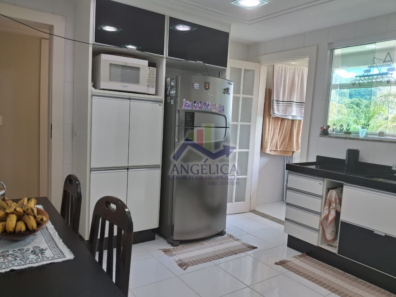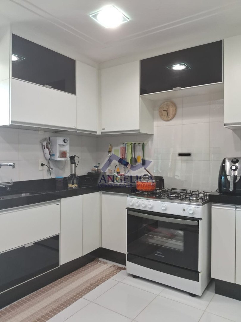 A cozinha espaçosa conta com armários planejados que permanecem no imóvel, integrada a uma lavanderia independente.